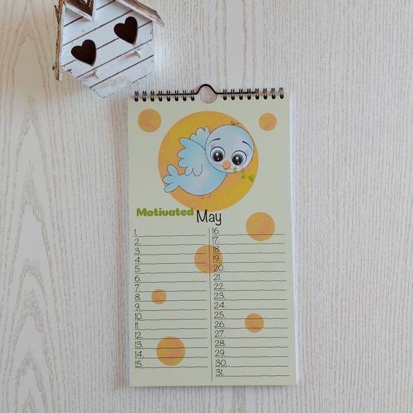 Deze vrolijke verjaardagskalender heeft 12 verschillende lieve illustraties, ontworpen door Studio Happy busy.